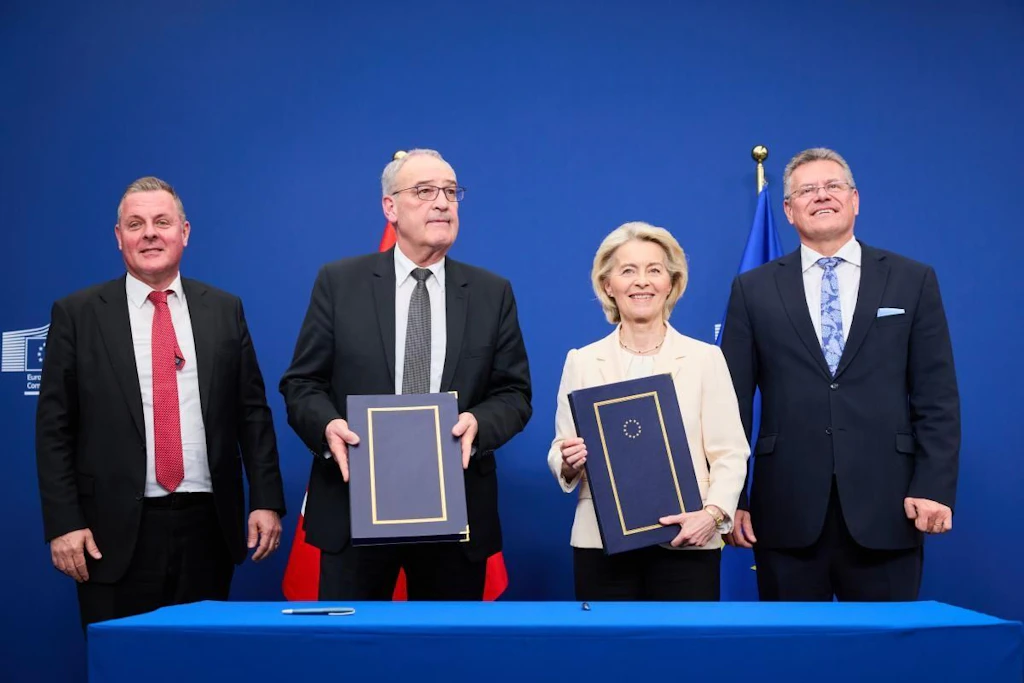 Le 2 mars 2026, le président de la Confédération Guy Parmelin et la présidente de la Commission européenne Ursula von der Leyen ont signé à Bruxelles les accords du paquet Suisse–UE.